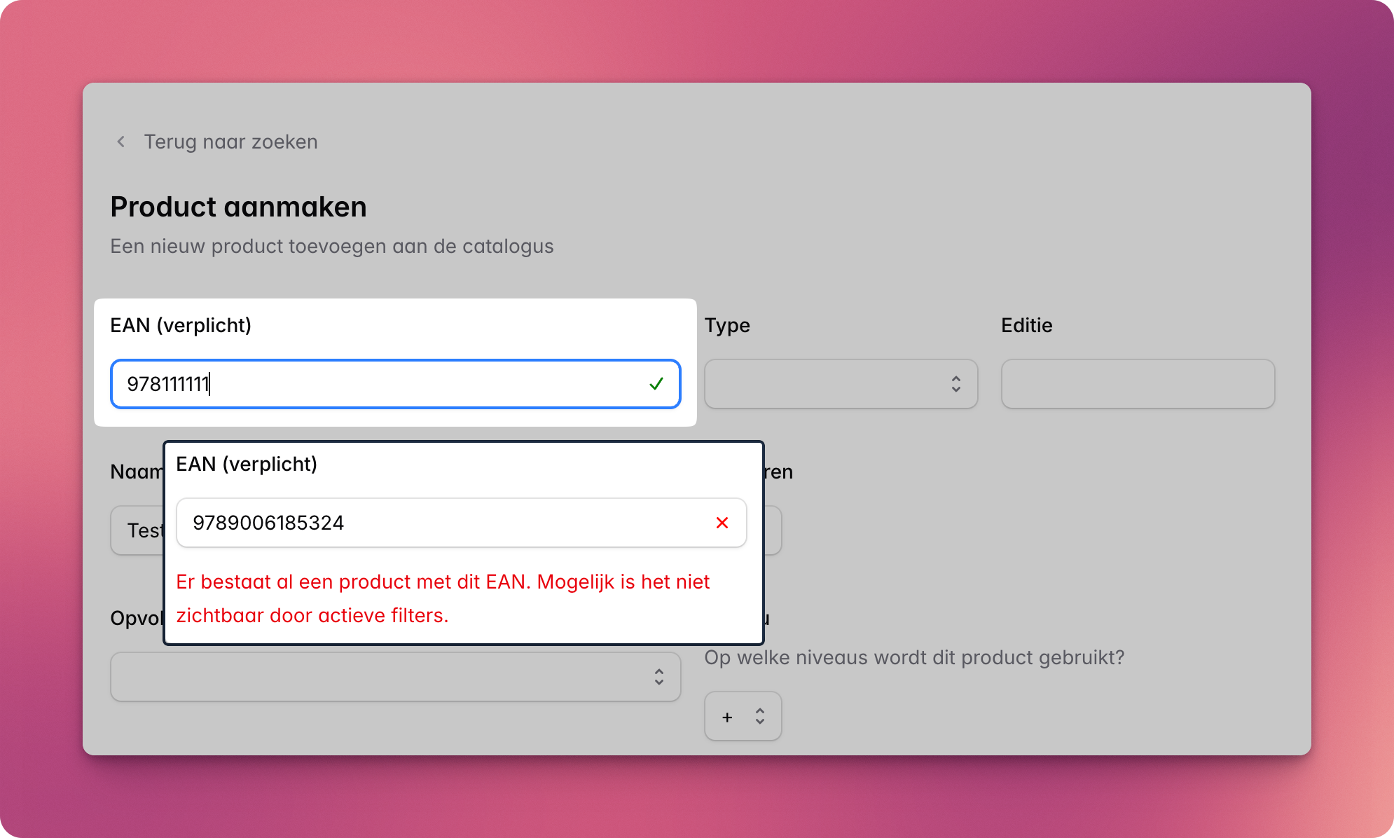 In het formulier wordt automatisch getoetst of de ingevulde EAN niet toch aanwezig is in de catalogus. Dit zie je direct bij het invoerveld terug. Elke keer dat je iets aan de invoer wijzigt doen we deze test opnieuw.