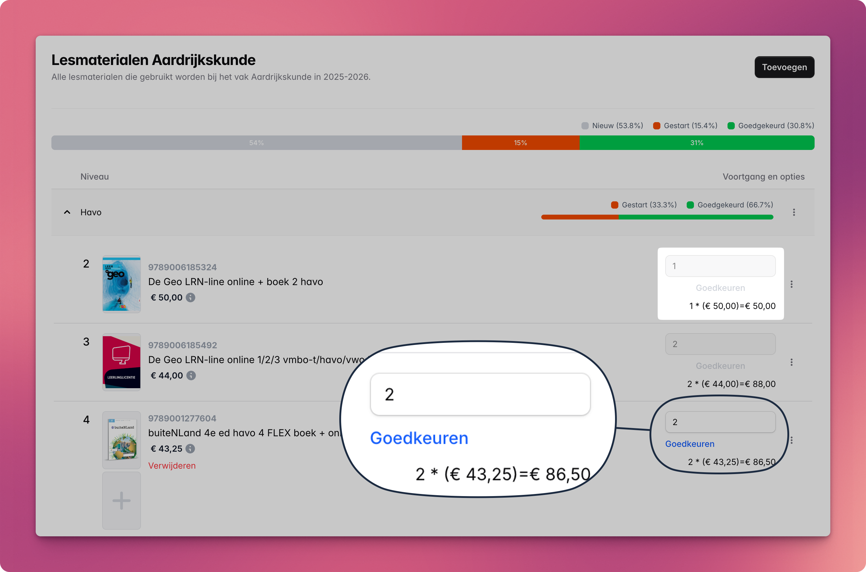 Wanneer je in het menu 'Leermiddelenkeuze' kiest en daarna een specifiek vak selecteert zie je op het overzichtsscherm eerst alle niveaus ingeklapt. Wanneer je vervolgens een vak uitklapt zie je in elke regel aan de rechterkant een invoerveld voor een prognose, met daaronder een knop om de producten goed te keuren.